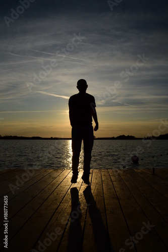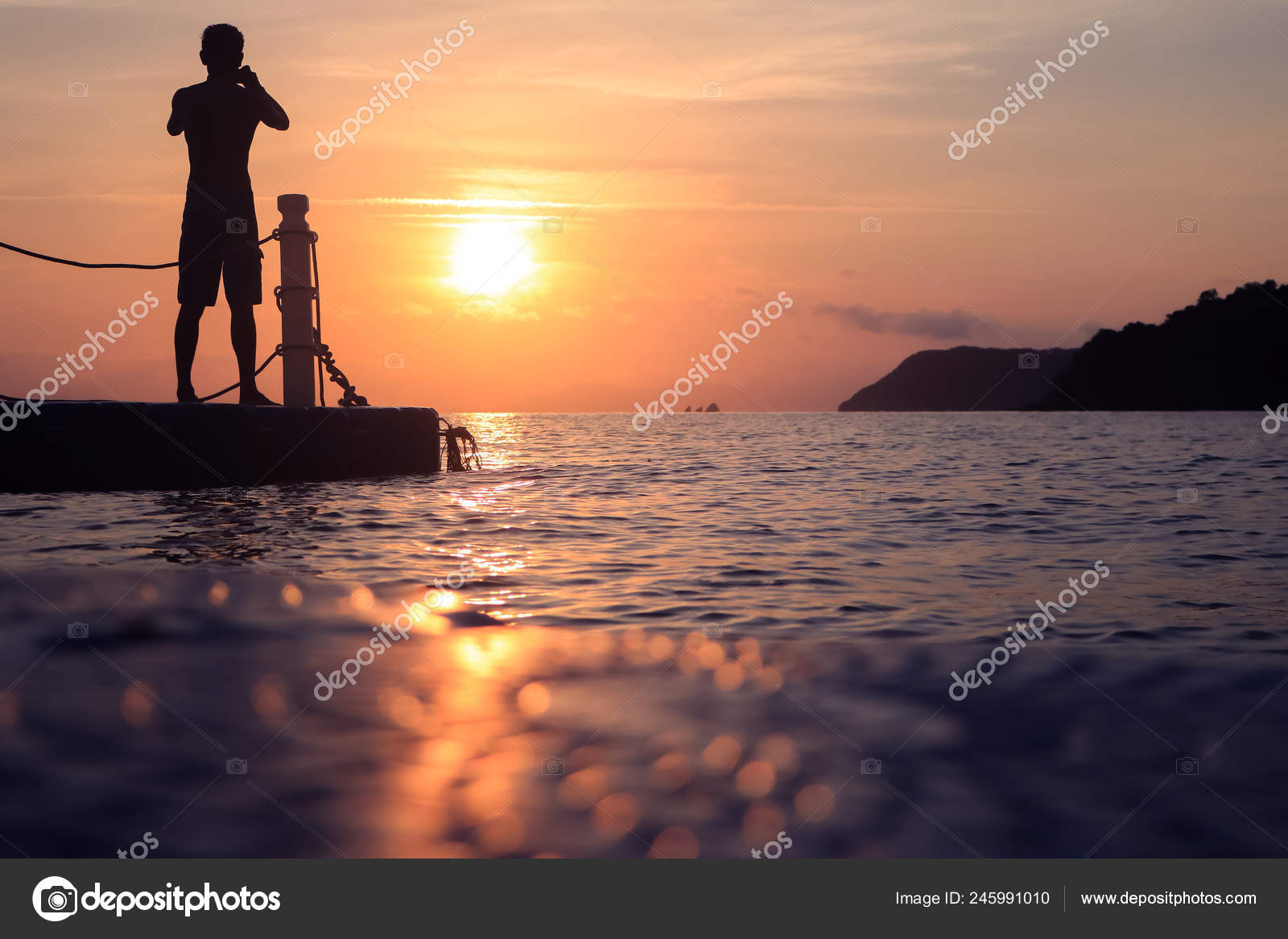Asian Man Standing Jumping Floating Pier Sunrise Silhouette Body